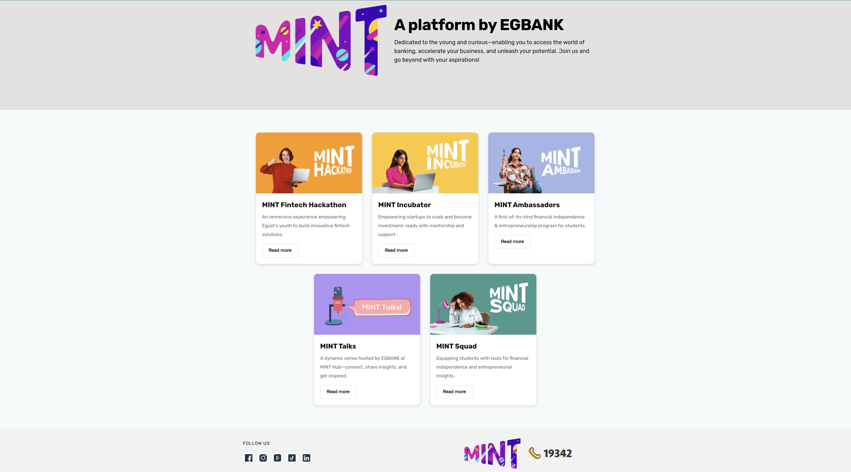 MINT by EG Bank is a dedicated innovation & startup platform built using Untap, showcasing multiple programs and initiatives designed to support talent and ventures in Egypt.